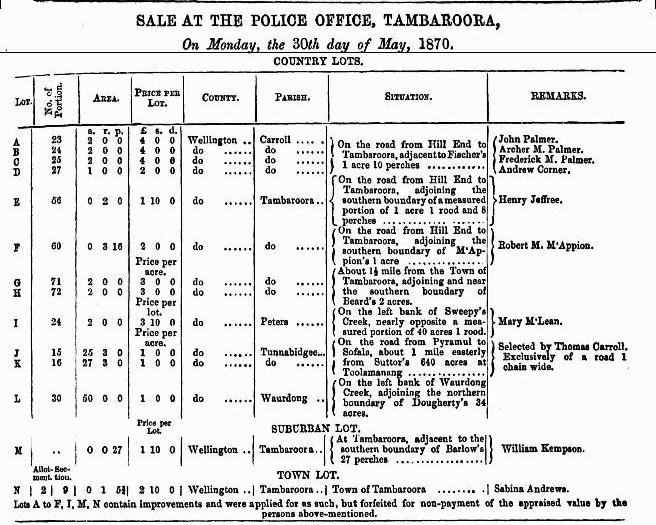 PALMER John - 30 May 1870 a Publican of Tambaroora PALMER Archer Money - 5 Jul 1887 Title Transfer by Application by Transmission HICKSON Benjamin - 5 Aug 1887 Title Transfer WARRY Reginald Alfred - 13 Dec 1963 Title Transfer |