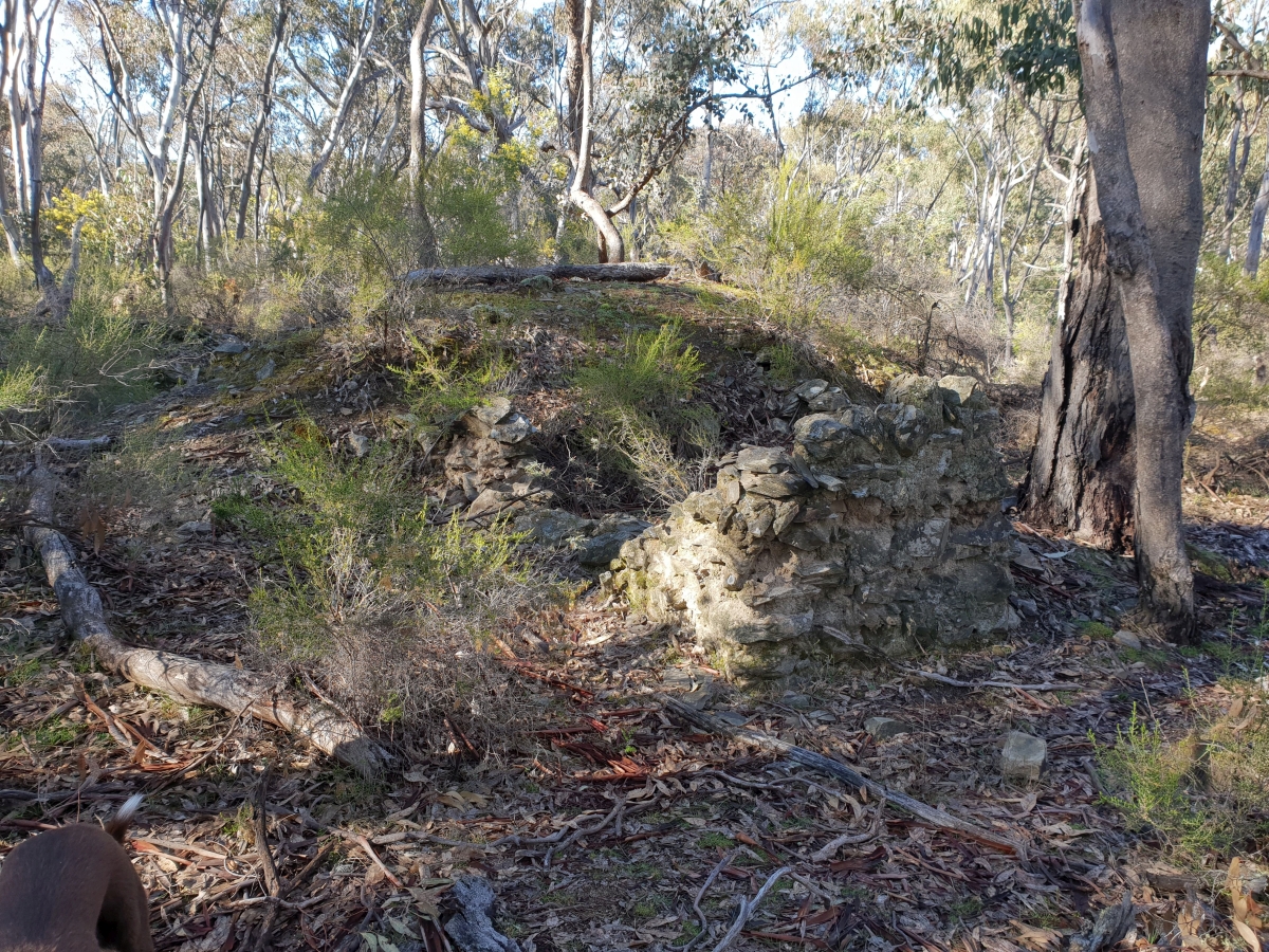 Comment: Remnants of a stone structure. This structure appears to be made up of stone walls and a stone fireplace, on the outside of the eastern wall there is a mound of tailings which have been stacked up against the wall. (653)