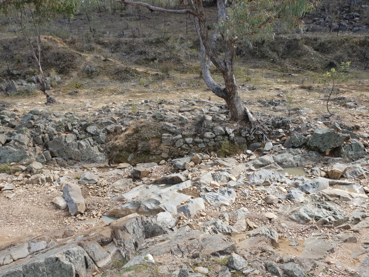 Comment: Remnants of a stone wall situated on the bank of Tambaroora Creek. Two levels of the bank can be identified in the image, the higher level seen in the upper part of the image and the lower level where the tree is growing just above the stone wall. This indicates the level at which the miners were working when the stone channel was constructed. The current creek bed being post the construction period. (653)